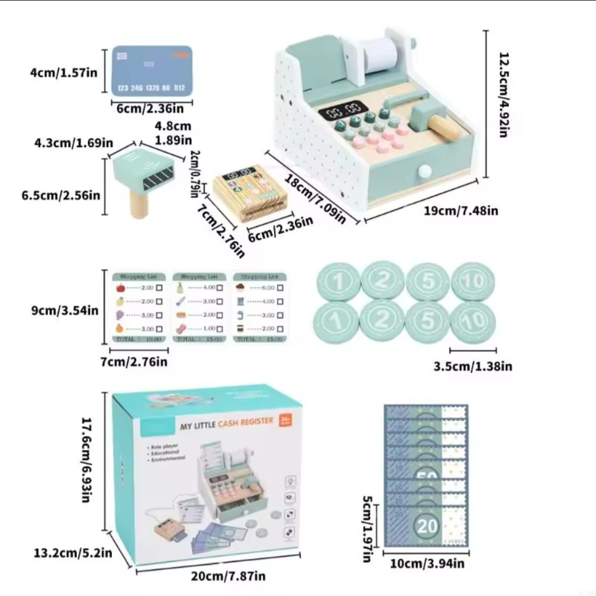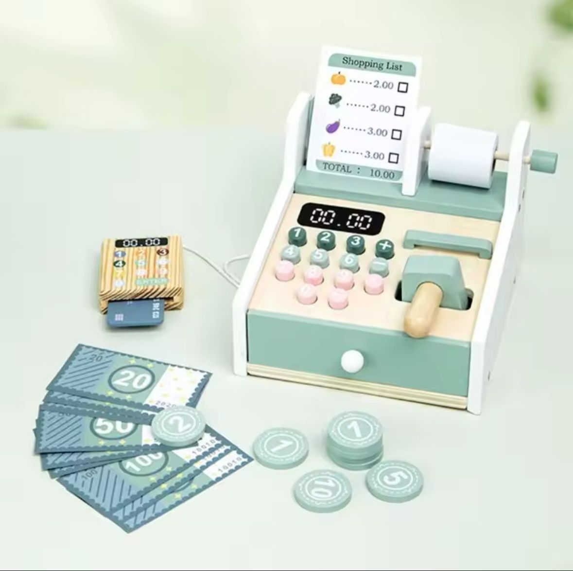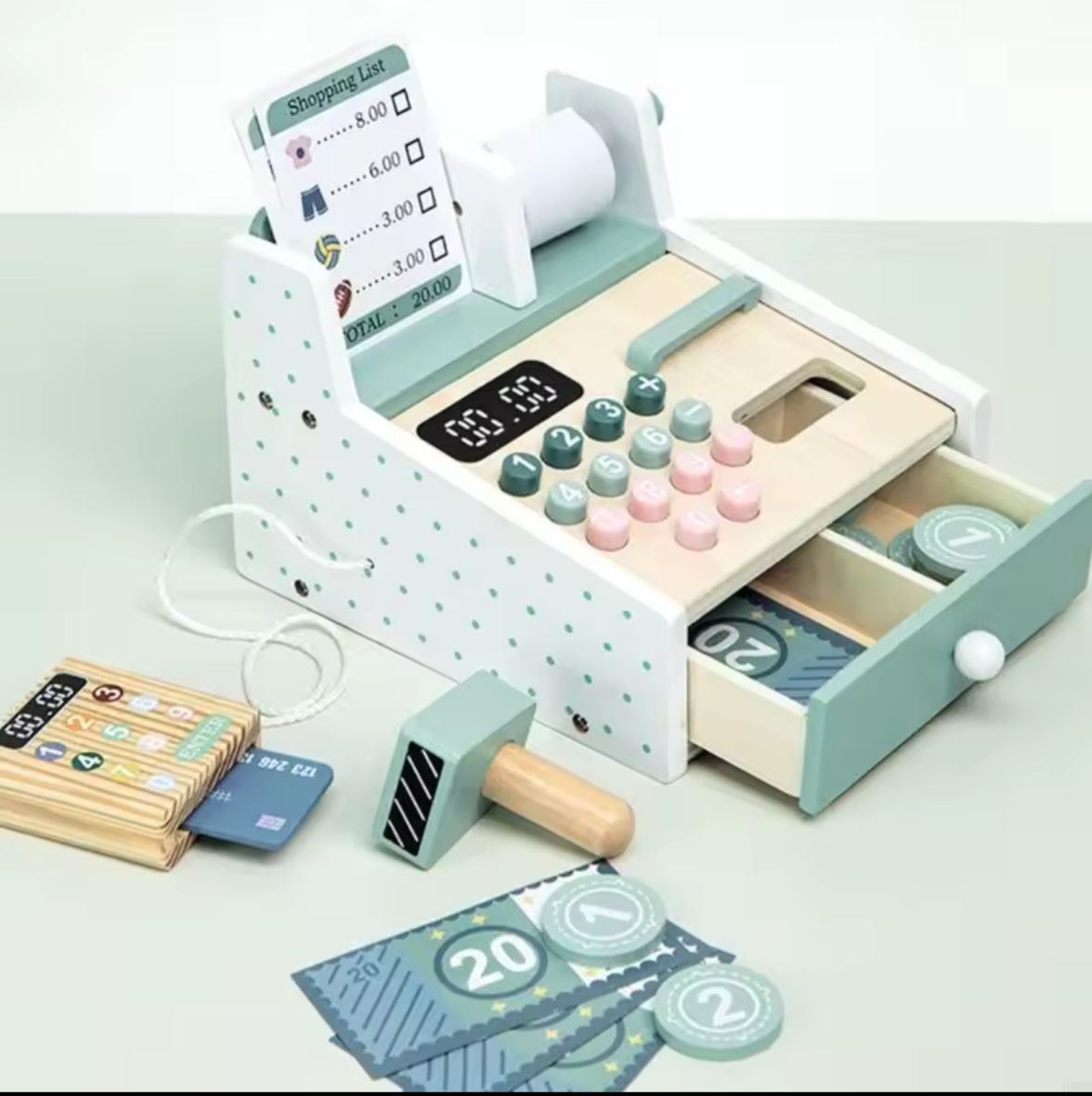 Te ofrecemos esta caja registradora de madera diseñada para el juego simbólico, ideal para que niños y niñas se conviertan en cajeros/as, compradores o vendedores mientras desarrollan habilidades clave.